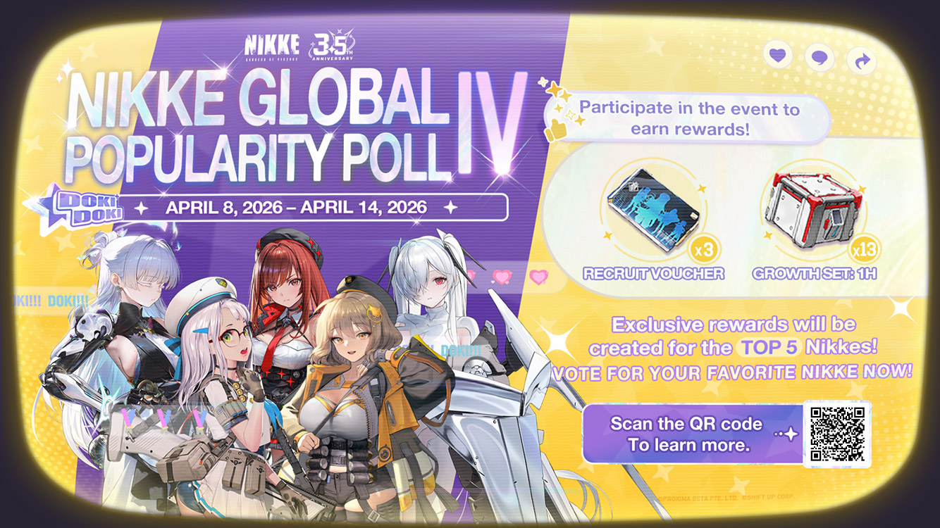 1. 今回の人気投票の対象は4月8日までに獲得できるニケ(限定ニケとコラボニケを除く)です。過去の人気投票の優勝者である「モダニア」、「レッドフード」、「ラピ:レッドフード」は名誉の殿堂入りを果たしたため、投票に含まれません。